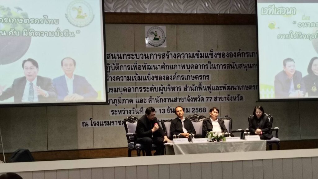 วันที่ 11-13 ธันวาคม 2568 นางรวยทิพย์ อุตมะ หัวหน้าสำนักงานกองทุนฟื้นฟูและพัฒนาเกษตรกร สาขาจังหวัดตาก เข้าร่วมอบรมโครงการส่งเสริมและสนับสนุนกระบวนการสร้างความเข้มแข็งองค์กรเกษตรกร ปี 2569 โดยมีนางวรรณี มหานีรานนท์ เลขาธิการกองทุนฟื้นฟูและพัฒนาเกษตกร ทำหน้าที่เป็นประธาน โดยการจัดโครงการนี้มีจุดเริ่มต้นจากความมุ่งมั่นของกองทุนฟื้นฟูฯ ในการยกระดับศักยภาพเกษตรกรไทยให้เข้มแข็งอย่างยั่งยืน ทั้งด้านการฟื้นฟู การพัฒนาอาชีพ และการรวมกลุ่มเพื่อแก้ไขปัญหาในพื้นที่ได้อย่างมีประสิทธิผล โครงการจึงถูกออกแบบมาเพื่อกระตุ้นให้สมาชิกมีส่วนร่วมในกิจกรรมของกองทุนมากขึ้น